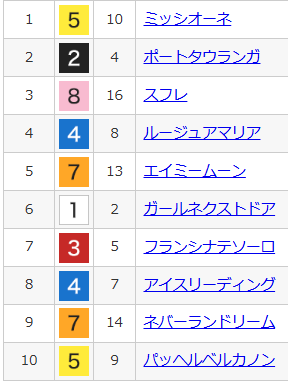 6・    魔女っこ    (あんまり場数熟してないからね)    ラスティングスノー     16着