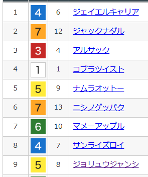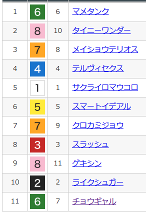 イヌボウノアサヒ 1着 220 110アイアムステキ 5着 オーパパ 7着 ピカピカサンダー 1着 230 130ジャンタルマンタル 2着 110 キミガスキダ 9着 ジョリュウジャンシ 9着 イッテラッシャイ 3着 1160トゥントゥントゥン 10着 ヴーレヴー 12着