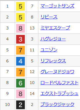 ユイノナナフシギ 6着 モズミギカタアガリ 5着 ムギトルナ 3着 270 ミアエッテ 2着 230 ピンパンポン 10着 フロムダスク 16着 ビッグヒーロー 2着 110 ブラックジャック 10着 コレデヨカロウ 10着 ゾンニッヒ 15着