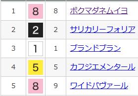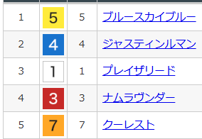 1・ 王様 (休養たっぷり) カンチェンジュンガ 1着 3702・ オイラ (ちょっと人気し過ぎ感) ママコチャ 2着 1203・ 番人 (複勝は2番人気) トウシンマカオ 3着 1304・ オイラ (今回は微妙な順位) テイエムスパーダ 4着5・ ポンP (今回はダメな方) カルチャーデイ 9着6・ 暗子 (良くなかった) レッドアヴァンデイ 12着7・ 魔女っこ (更に良くない) グランテスト 14着