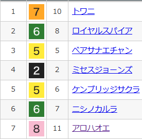 トンガリボウシ 7着 ダーリンダーリン 12着 タカネノハナコサン 8着 ワラビガミ 10着 ミライヘノヒーロー 9着 ヒコボシ 8着 シランケド 1着 340 140 アイルトン 8着 ハネマン 7着 イージーライダー 5着