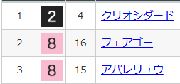1・ 勇者 (1着は久々) カムニャック 1着 3402・ 王様と魔女っこ (今回全員名前買いだから) パラレディーヌ 4着4・ ポンP (カワイイ名前ではあるけど) リンクスティップ 5着5・ オイラ (愛が足りない) アイサンサン 12着6・ 暗子 (オペラのようには) レーヴドロペラ 14着