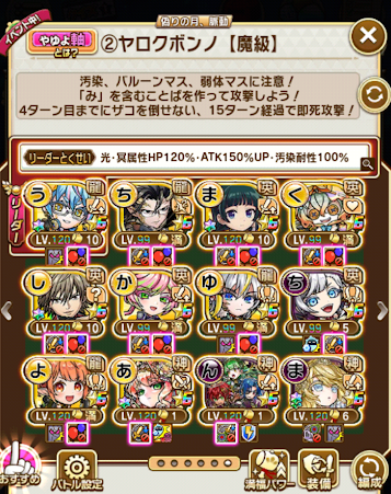 今回は一日一回挑戦するタイプの簡単な方です。コラボはずっとこんな感じになるのかな?今回は大統領以外全員コラボで、メリオダスとか結構長い事光パでレギュラー格だったんですけど、近年は倉庫番で出番は久しぶりです。