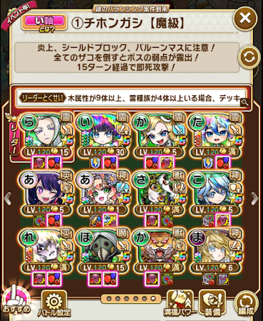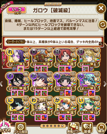 今回は一日一回挑戦するタイプの簡単な方です。コラボはずっとこんな感じになるのかな?今回は大統領以外全員コラボで、メリオダスとか結構長い事光パでレギュラー格だったんですけど、近年は倉庫番で出番は久しぶりです。