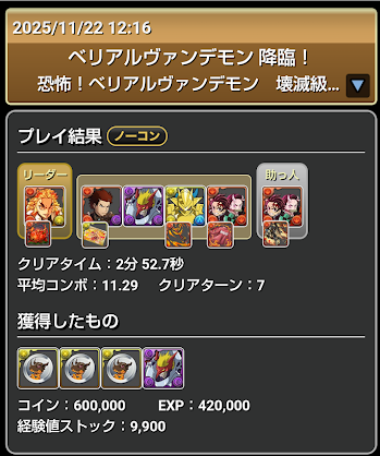 壊滅級の方を鬼滅バッジで。早速シールド2枚破壊くんが役に立ってます。全員変身や進化スキル無しなので結構サクサク回せるのも有難い。てか難易度低くて助かるわ。