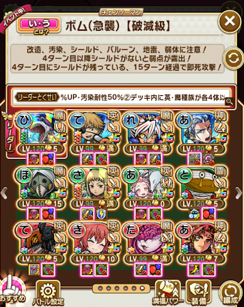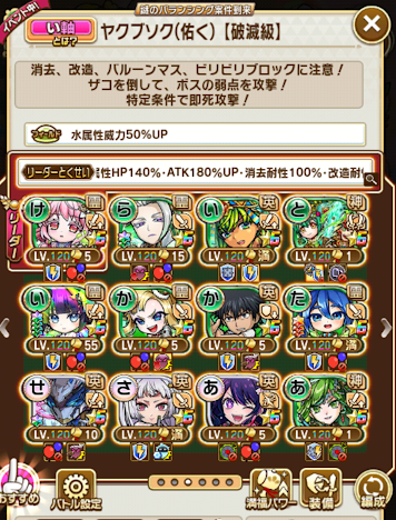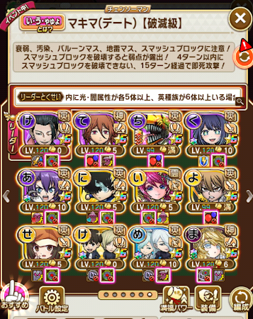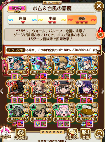 最適リーダーに助っ人を使い、グランドを最低一体、ここまでしてソロでまぁまぁギリギリ。章の開始からこの難易度は流石にエグイ。一応寄生すれば代替で行けない事もないけど、一回はソロクリアしないと一部キャラが言塊突破出来ない仕様にするとか運営も細かい嫌がらせを仕掛けてくるようになった。まぁ言塊突破は必ずしも必要ではないので、そこまで気にしなくてもいいかな、今の所。