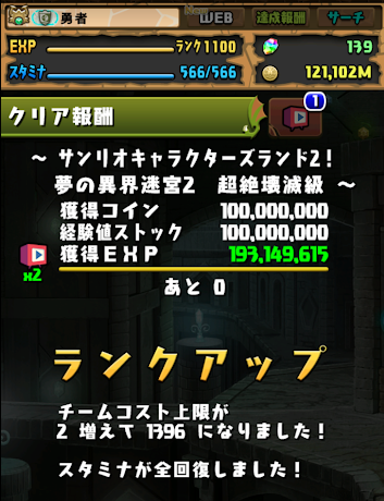 具体的にはどう頑張ったかというと、10月前半はハロウィンの最近はサンリオの闘技場を頑張りました。共に経験値1億ダンジョンですが、今月だけで16上げです。いやホントがんばった。