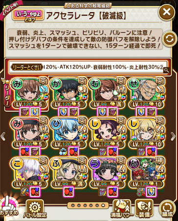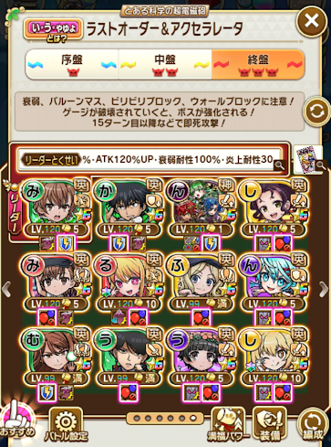 当初は上条リーダーで始めたものの、水属性とか指定色に一生出てこない上に、適性のあるキャラも少ないので御坂美琴にバトンタッチ。やはりこちらの方が安定しますね。グランドがあまり入れられないという欠点はありますが、それは上条リーダーでも同じことです。英タイプのグランドキャラとかいないもん。つかイィタル&ヨヨヨミ以外全部神だタイプだな。