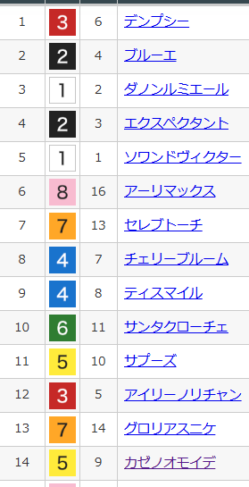 1・ 番人 (今週も堅い) スターアニス 1着 1402・ 勇者 (JFの勢い) ギャラボーグ 2着 3403・ オイラ (首差。惜しい) アイニードユー 4着4・ ポンP (今回も期待を裏切り) アランカール 5着5・ 魔女っこ (エレガントじゃないなー) エレガントアスク 8着6・ 王様 (輝かない) ディアダイヤモンド 12着7・ 暗子 (大外だしね) プレセピオ 16着