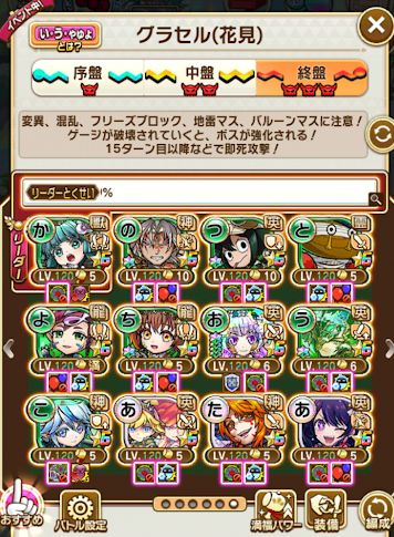 超決戦シリーズはここまでリーダーで困った事は無いのだけれど、今回どうなん?ボックスを見渡しても太刀打ちできそうなのは彼女しかいなかったぞ。このダンジョン降臨とかと違ってよそ様のクリアメンバー見られないしマルチも不可だから、みんなどうやってクリアしているのか今一つわからないんだよねぇ。個人的には48体用意しなきゃいけない討伐戦よりは手軽で好きなんだけど。