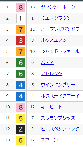 1・ 番人 (1番人気!しかもレコード!) ロブチェン 1着 1702・ ポンP (外だろうと関係ない) リアライズシリウス 2着 2503・ 王様 (今週も首差。惜しい) アスクエジンバラ 4着4・ 勇者 (惜しくは無いけど頑張った) グリーンエナジー 7着5・ 暗子 (最低人気だ、頑張った) ラージアンサンブル 8着6・ オイラ (確かに下馬評は良くなかった) ゾロアストロ 12着7・ 魔女っこ (なかったふ) パントルナイーフ 14着