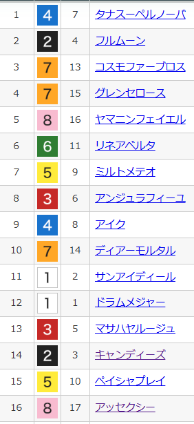 イサチルニャーニャ 13着 ヨカオウ 15着 オオアバレ 9着 ジュンドラドラ 2着 130 ホグホグナナハン 12着 ブルースカイブルー 5着 ウフドゥウフ 4着 アッセクシー 16着 キャンディーズ 14着 イツモニコニコ 12着