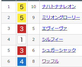 ゴーゴーマンゴー 11着ニシノトマラナイ 9着ワッフル 6着 ワカワカ 12着イコミキマル 16着 ユイハホンキダゼ 7着 シルブプレ 16着 ボンボンブーケ 16着ココボロ 11着ママコチャ 9着