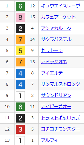 サルヴァトーレ 8着 パドメ 9着 ハッコウイチウ 2着 2700シックスパック 9着 カンシン 8着 アルフィー 13着 ボクラヲツナグモノ 12着 マルチャン 7着 ショウヘイ 3着 300 ウチナータイム 6着