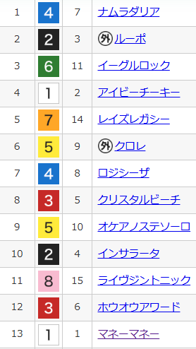 マネーマネー 13着 マツリダイコ 1着 710 240サスツルギ 12着 ガウディ 4着 ゴーゴーコクラ 13着 モーニンムスメ 11着 イッテラッシャイ 3着 300ハッピーマン 16着 マロ 9着 カズシ 6着